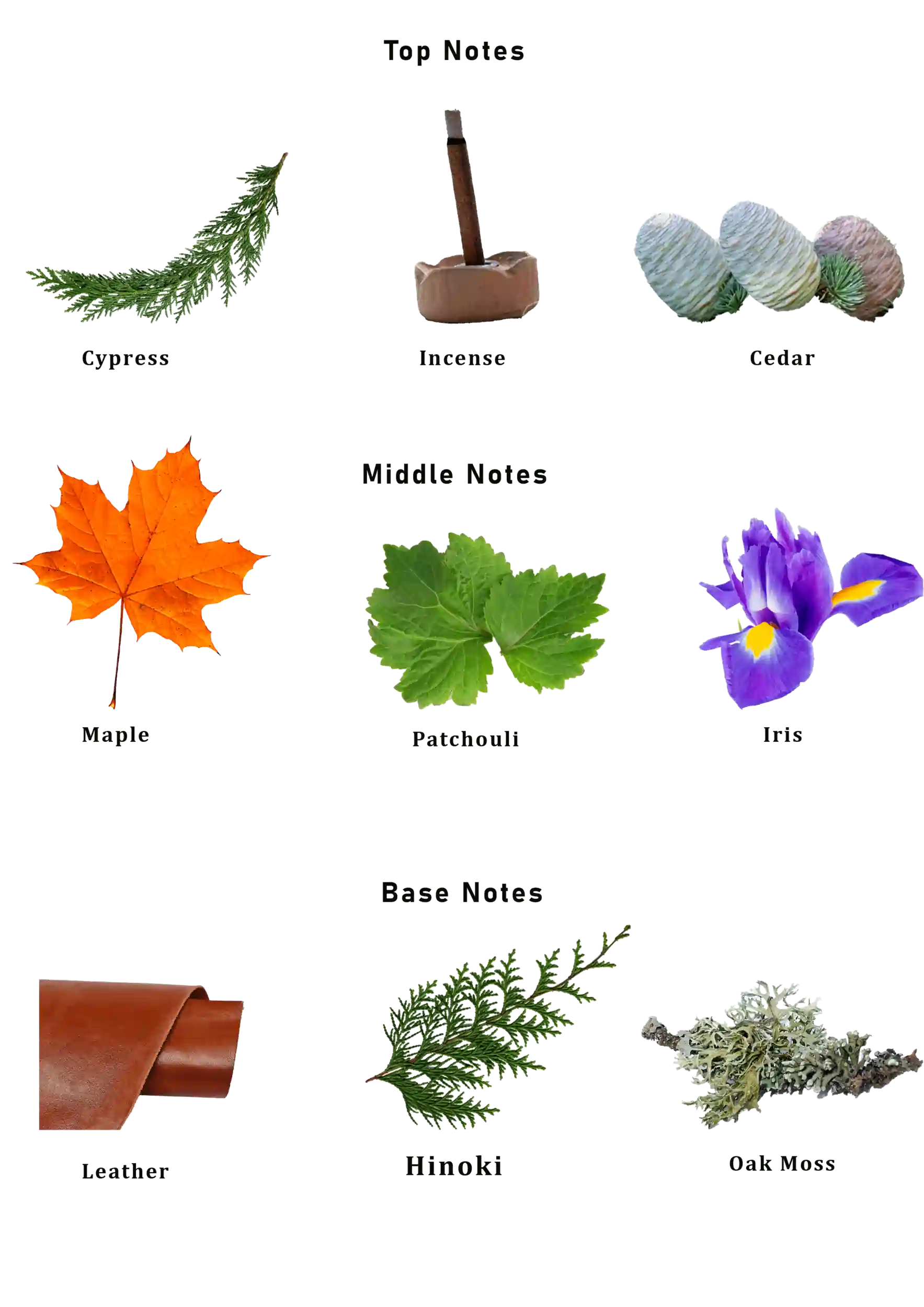 Patchouli and iris; base notes are Leather, Hinoki and Moss.